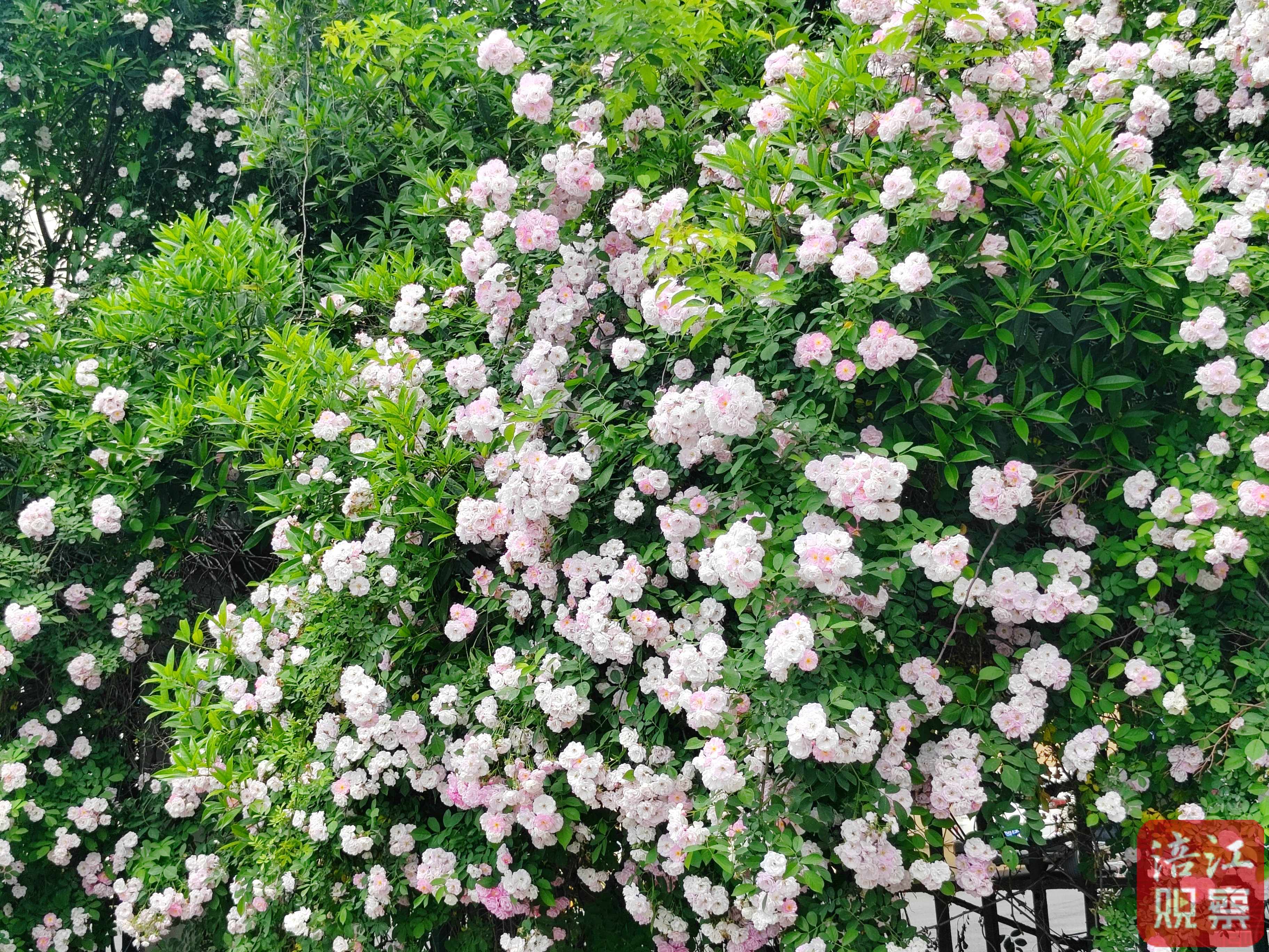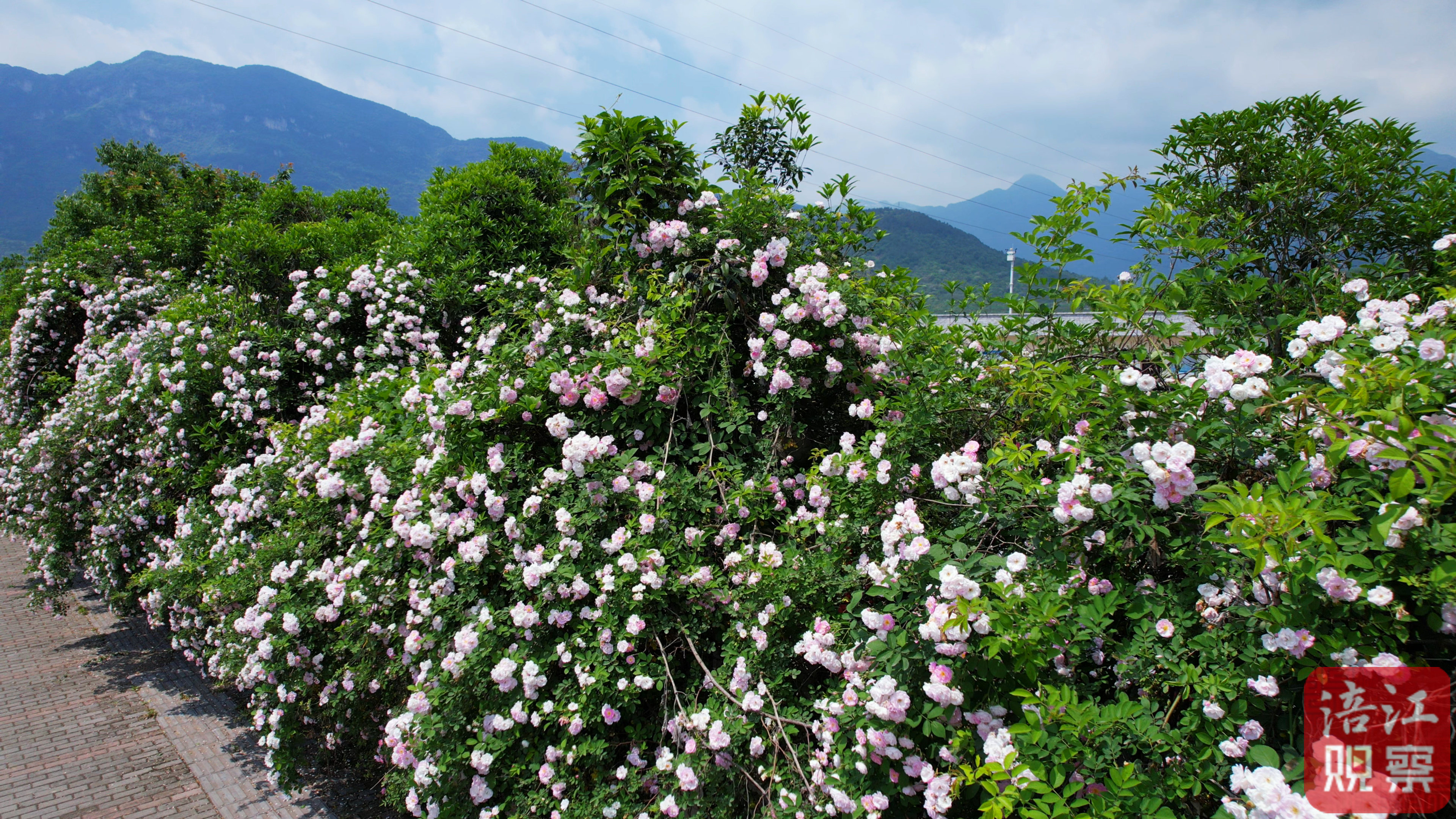 在江油市大康鎮(zhèn),主干道兩旁的薔薇藤蔓相互牽連,綴滿了雪白、粉紅的花朵,形成長達數(shù)百米的繽紛“花廊”,引得游客紛紛駐足欣賞、打卡拍照。