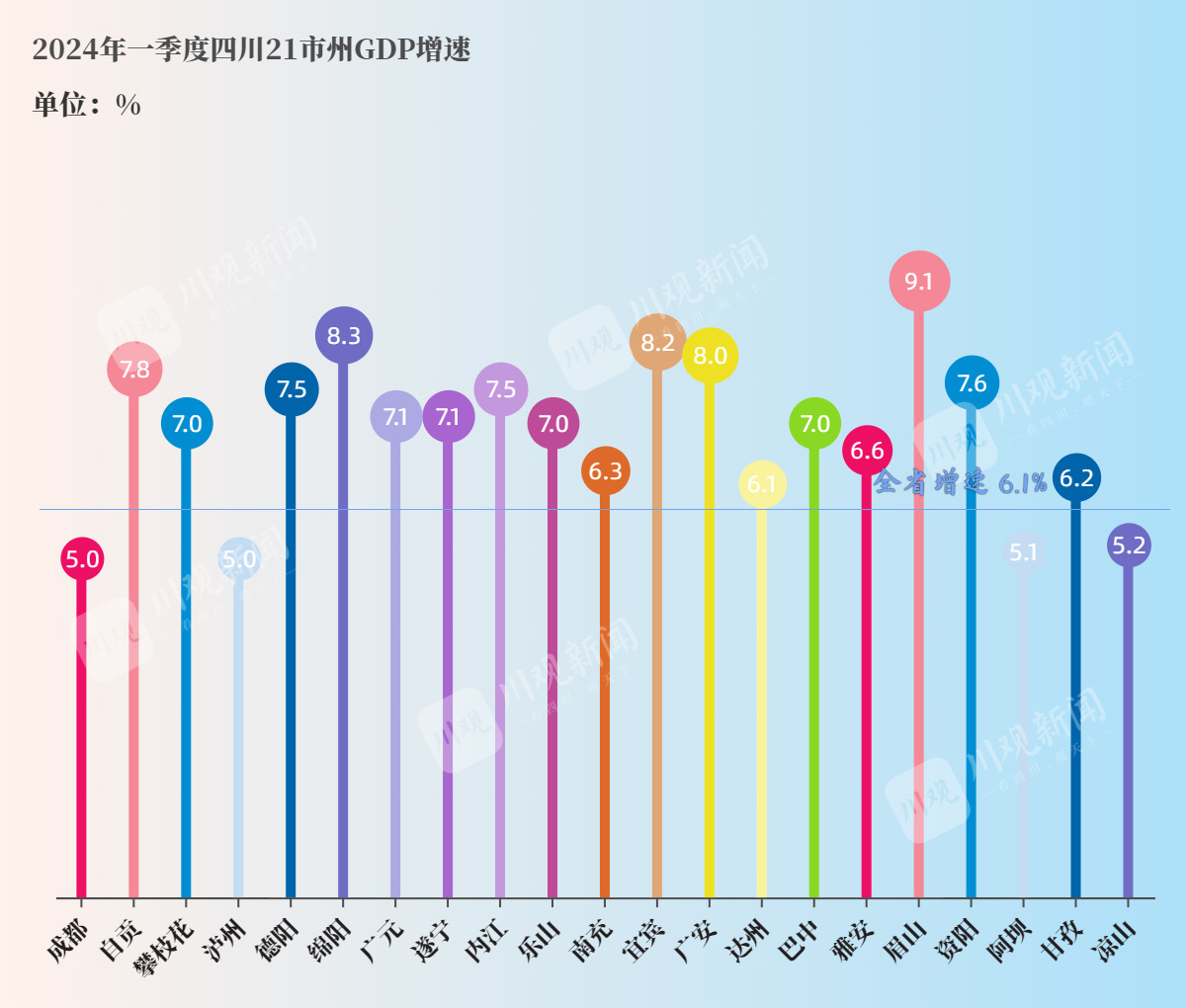 4月18日,四川一季度數(shù)據(jù)出爐,實現(xiàn)地區(qū)生產(chǎn)總值14142.6億元,按可比價格計算,同比增長6.1%。隨后,21個市州一季度成績單也陸續(xù)對外公布。全省經(jīng)濟(jì)實現(xiàn)良好開局,在全省經(jīng)濟(jì)大盤中,市州表現(xiàn)如何?