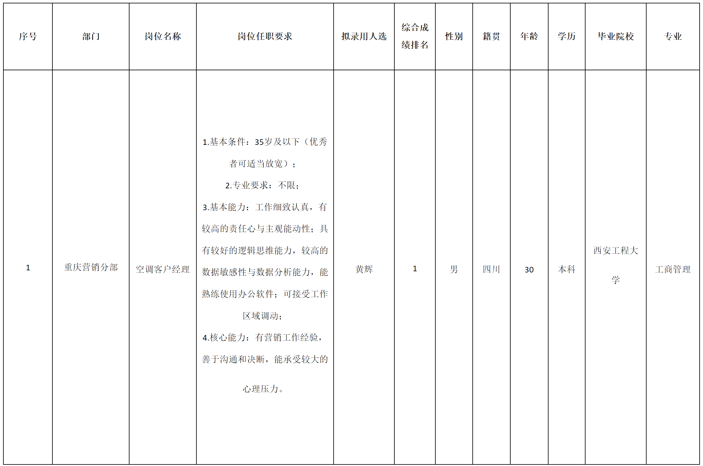 根據(jù)四川智易家網(wǎng)絡(luò)科技有限公司(長虹·美菱中國區(qū))發(fā)布的招聘公告及招聘相關(guān)規(guī)定,經(jīng)面試、考察、體檢等程序,擬錄用黃輝同志到重慶營銷分部工作,現(xiàn)予以公示,具體情況如下: