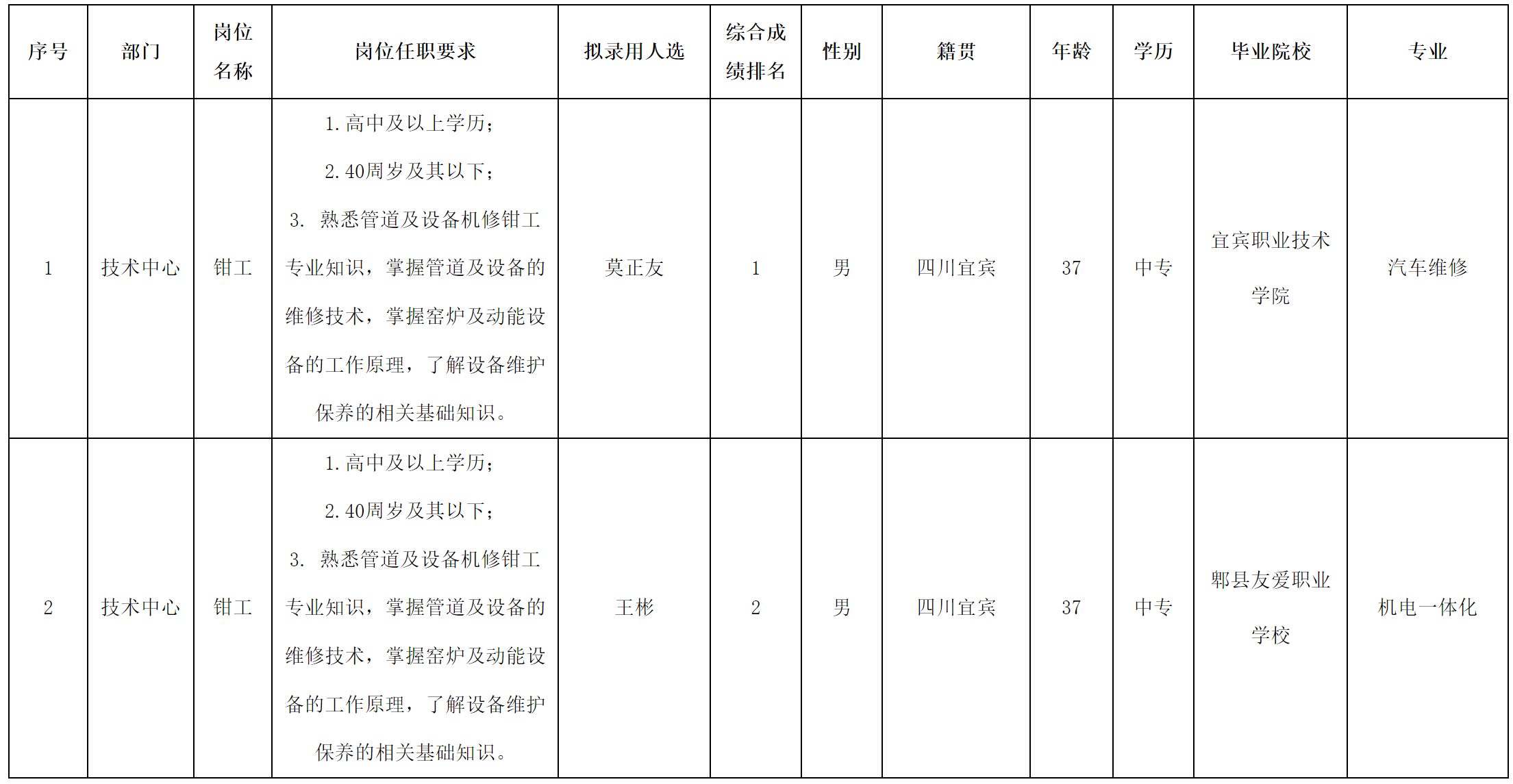 根據(jù)宜賓紅星電子有限公司發(fā)布的招聘公告及招聘相關(guān)規(guī)定,經(jīng)面試、考察、體檢等程序,擬錄用莫正友、王彬同志到技術(shù)中心工作,現(xiàn)予以公示,具體情況如下: