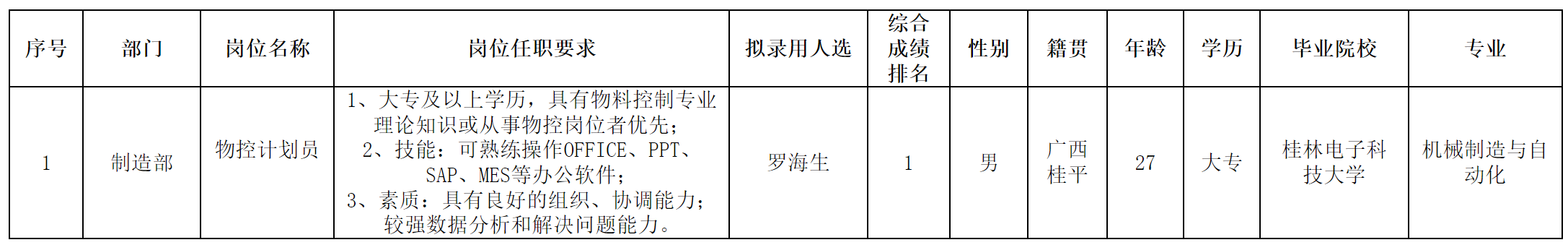 根據(jù)中山長虹電器有限公司發(fā)布的招聘公告及招聘相關(guān)規(guī)定,經(jīng)面試、考察、體檢等程序,擬錄用羅海生同志到物控計(jì)劃員崗位工作,現(xiàn)予以公示,具體情況如下: