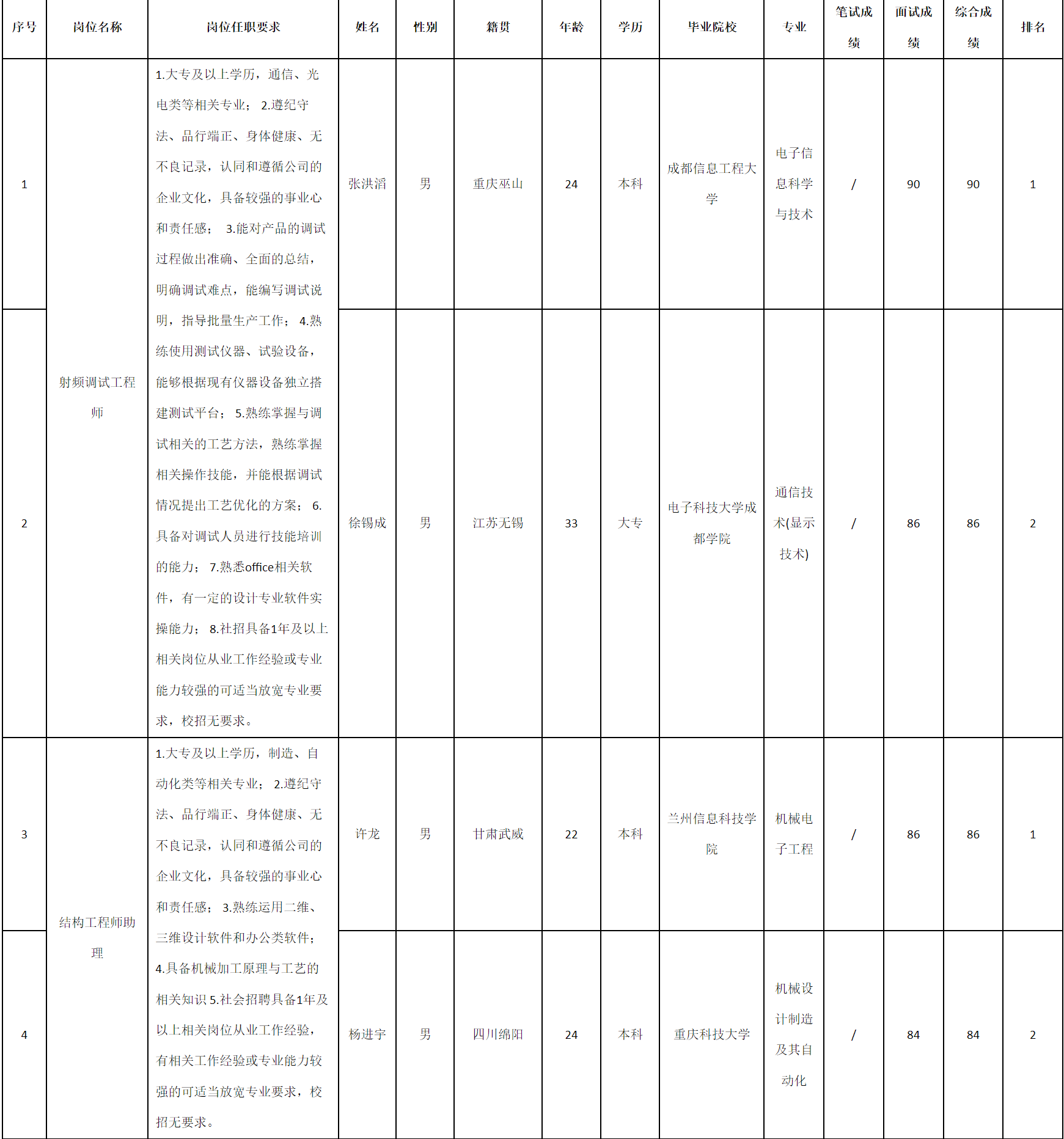 根據(jù)四川九強(qiáng)通信科技有限公司發(fā)布的招聘公告及招聘相關(guān)規(guī)定,經(jīng)筆試、面試等程序,現(xiàn)將筆試(面試)成績(jī)予以公示。