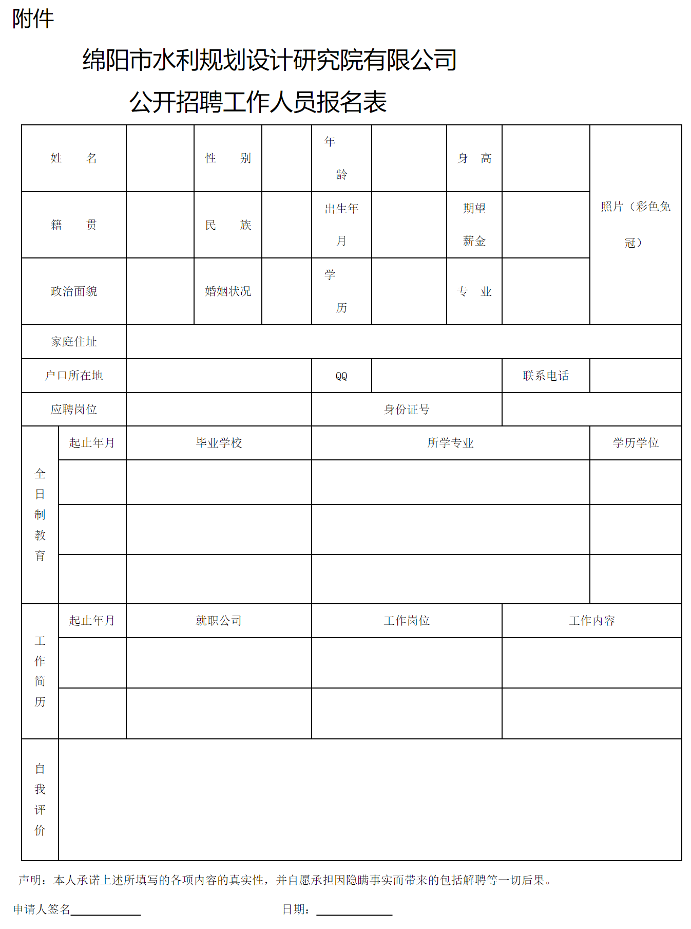 附件:綿陽(yáng)市水利規(guī)劃設(shè)計(jì)研究院有限公司公開招聘工作人員報(bào)名表