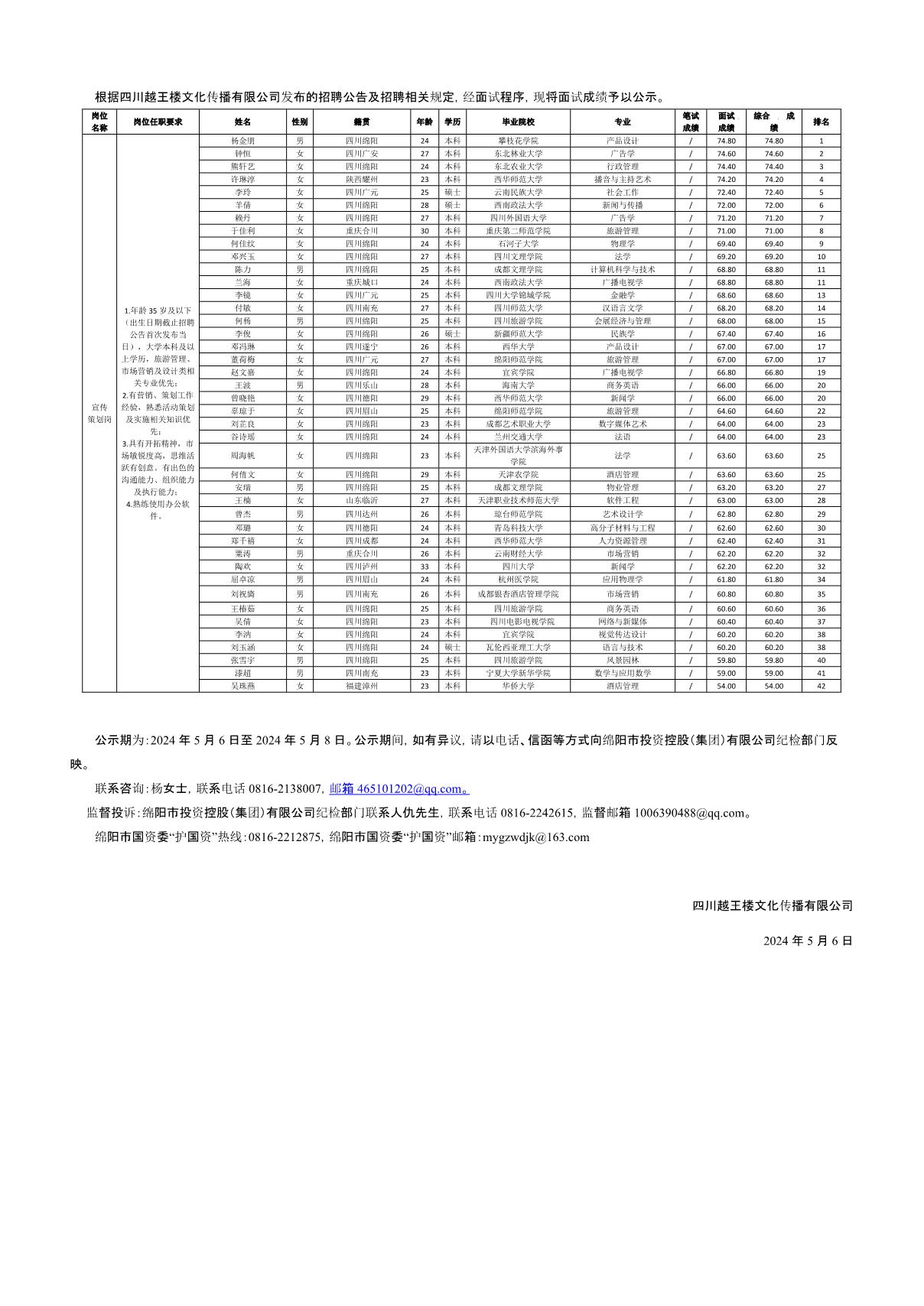四川越王樓文化傳播有限公司關(guān)于招聘宣傳策劃崗位測試成績的公示