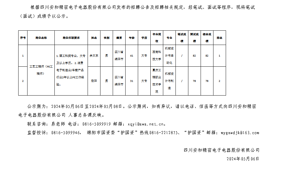 四川安和精密電子電器股份有限公司關于招聘工藝工程師測試成績的公示