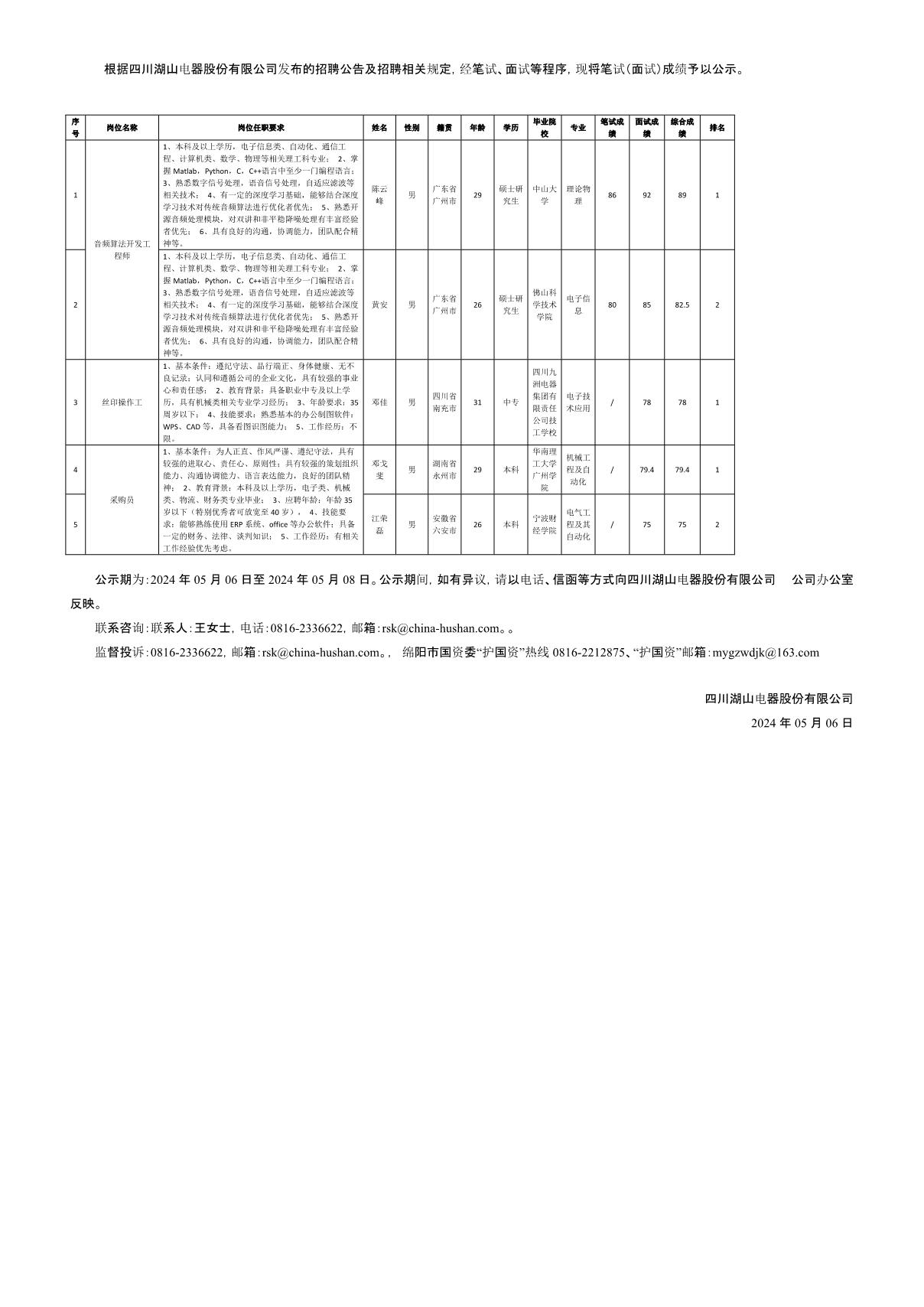 四川湖山電器股份有限公司關(guān)于招聘音頻算法開發(fā)工程師等崗位測試成績的公示