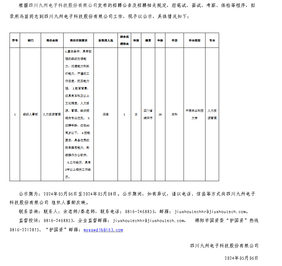 四川九州電子科技股份有限公司關(guān)于招聘人力資源管理擬錄用人員的公示