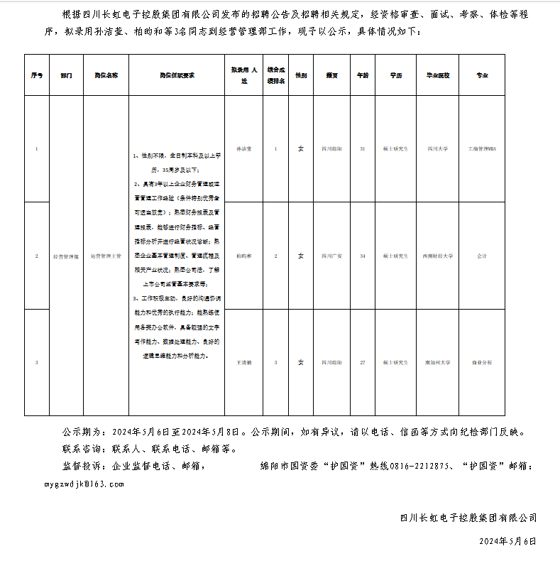 四川長虹電子控股集團(tuán)有限公司關(guān)于招聘運(yùn)營管理崗位擬錄用人員的公示