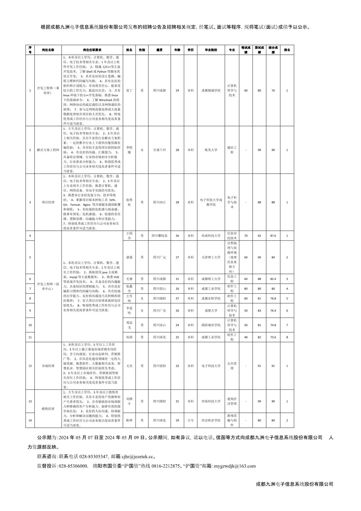 成都九洲電子信息系統(tǒng)股份有限公司關(guān)于招聘項(xiàng)目經(jīng)理等崗位測(cè)試成績(jī)的公示