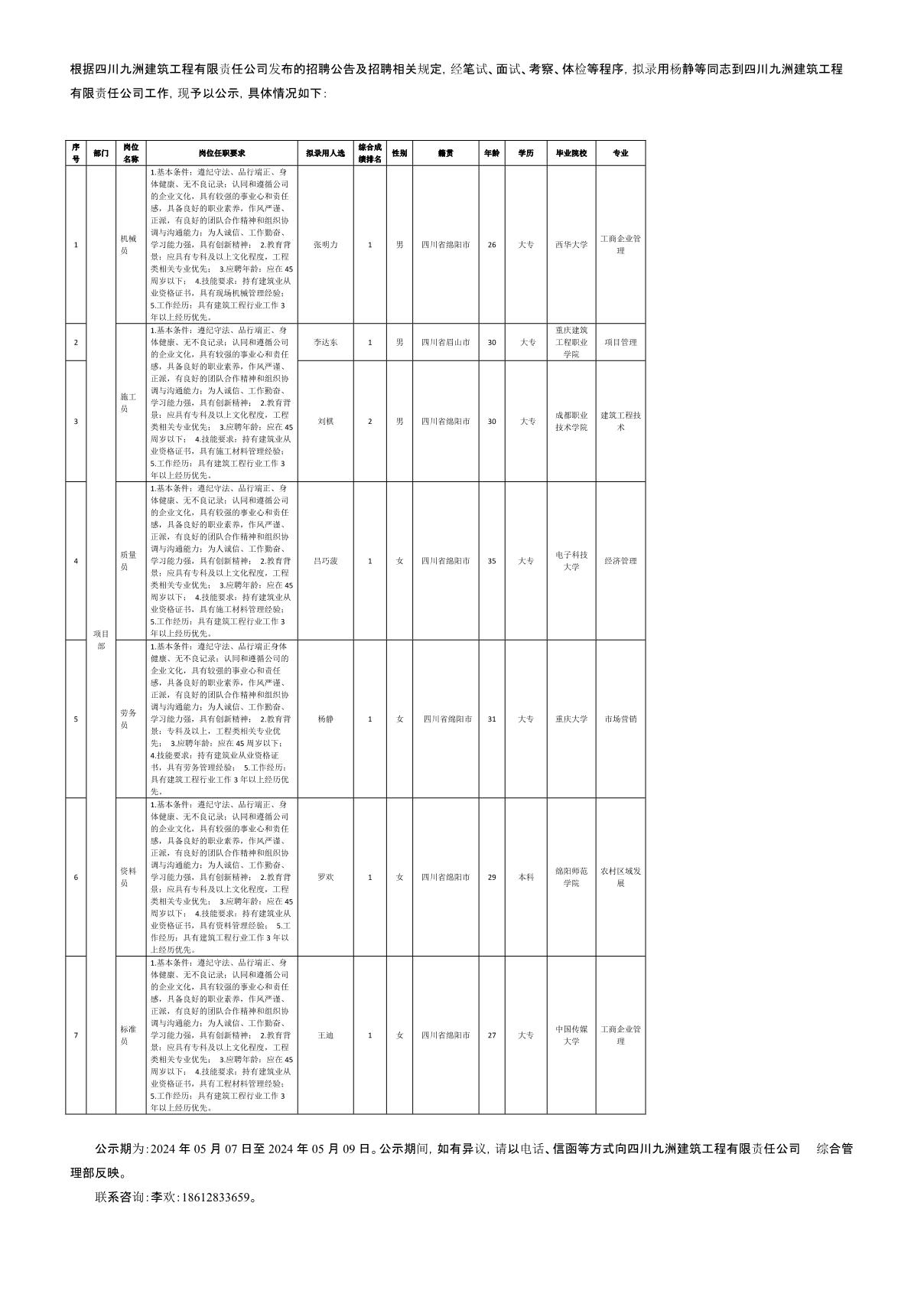 四川九洲建筑工程有限責(zé)任公司關(guān)于招聘 標(biāo)準(zhǔn)員等崗位擬錄用人員的公示