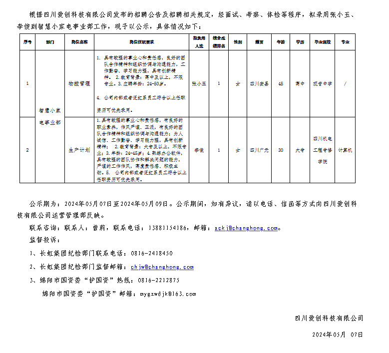 四川愛(ài)創(chuàng)科技有限公司關(guān)于招聘物控管理等崗位擬錄用人員的公示