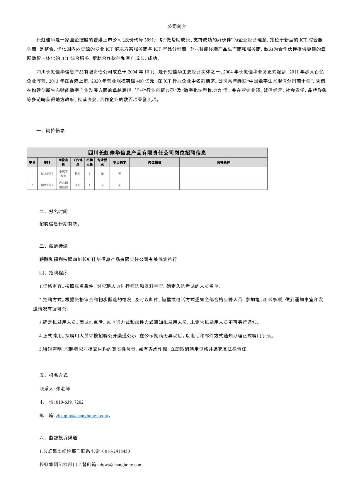 四川長虹佳華信息產品有限責任公司關于招聘系統(tǒng)工程師的公告