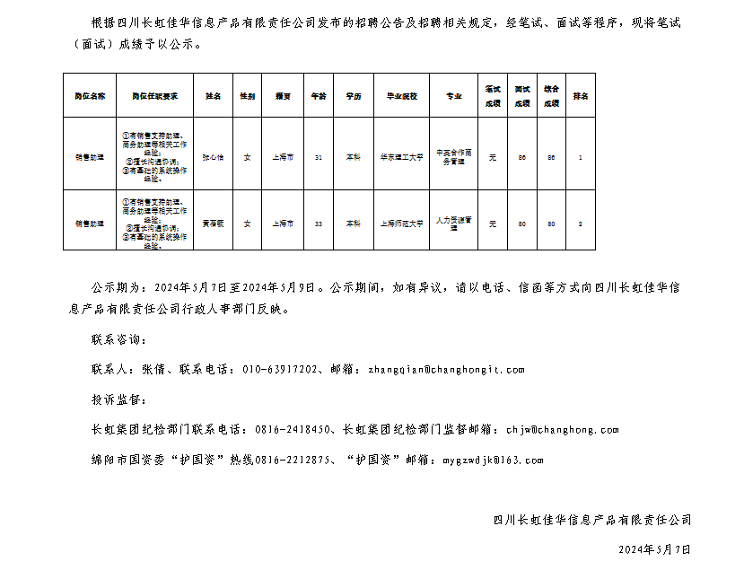 四川長(zhǎng)虹佳華信息產(chǎn)品有限責(zé)任公司關(guān)于招聘銷售助理測(cè)試成績(jī)的公示