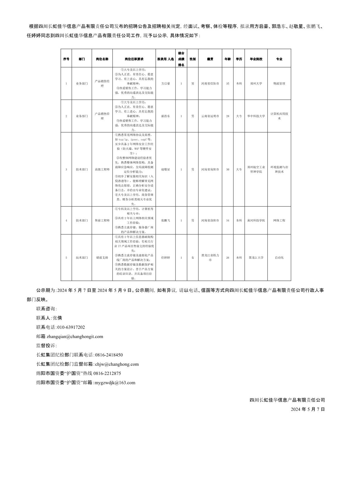 四川長虹佳華信息產(chǎn)品有限責(zé)任公司關(guān)于招聘高級工程師等崗位擬錄用人員的公示