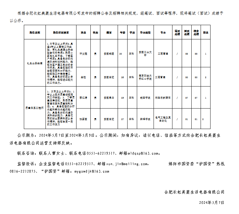 合肥長(zhǎng)虹美菱生活電器有限公司關(guān)于招聘禮品業(yè)務(wù)經(jīng)理測(cè)試成績(jī)的公示