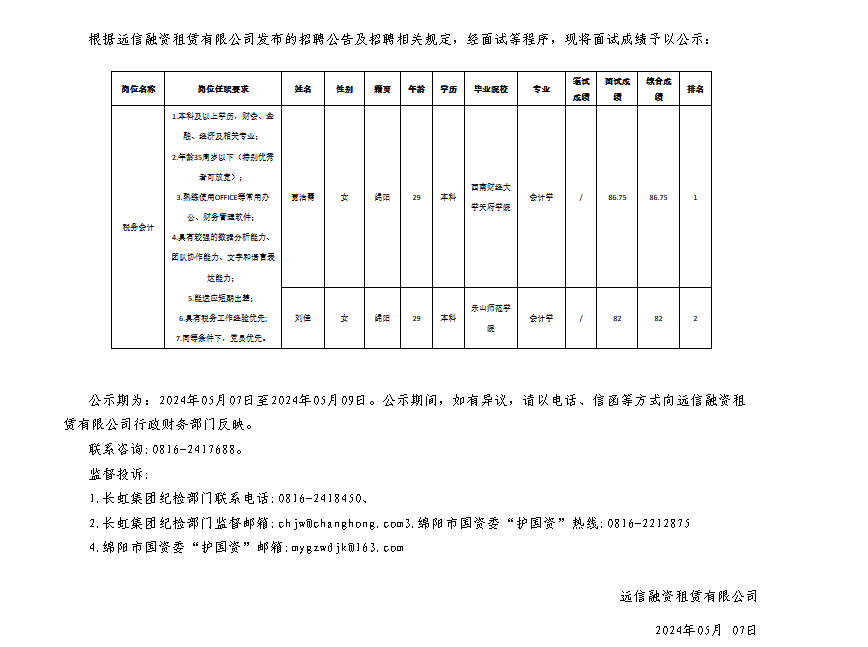 遠(yuǎn)信融資租賃有限公司關(guān)于招聘稅務(wù)會計(jì)測試成績的公示