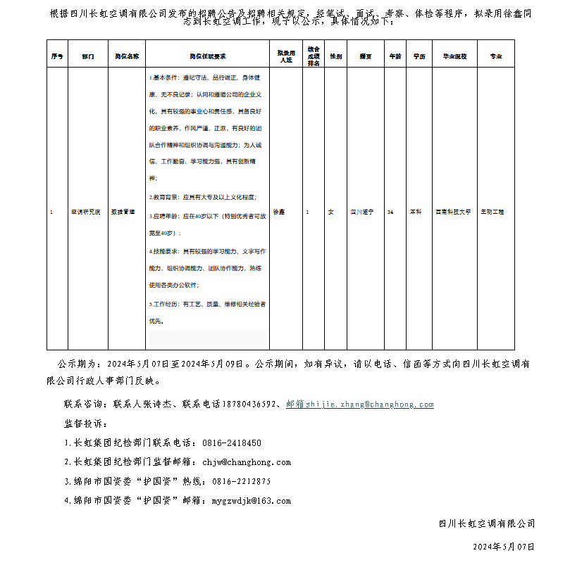 四川長虹空調(diào)有限公司關(guān)于招聘數(shù)據(jù)管理崗位擬錄用人員的公示