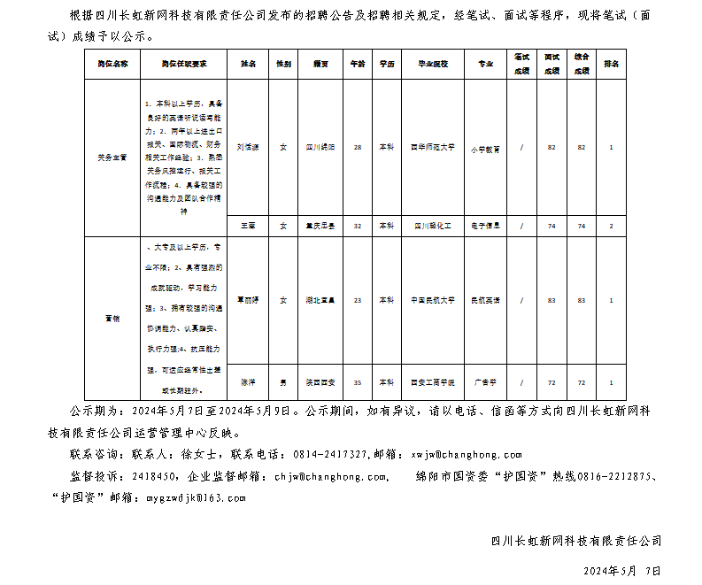 四川長虹新網(wǎng)科技有限責(zé)任公司關(guān)于招聘關(guān)務(wù)等崗位測試成績的公示