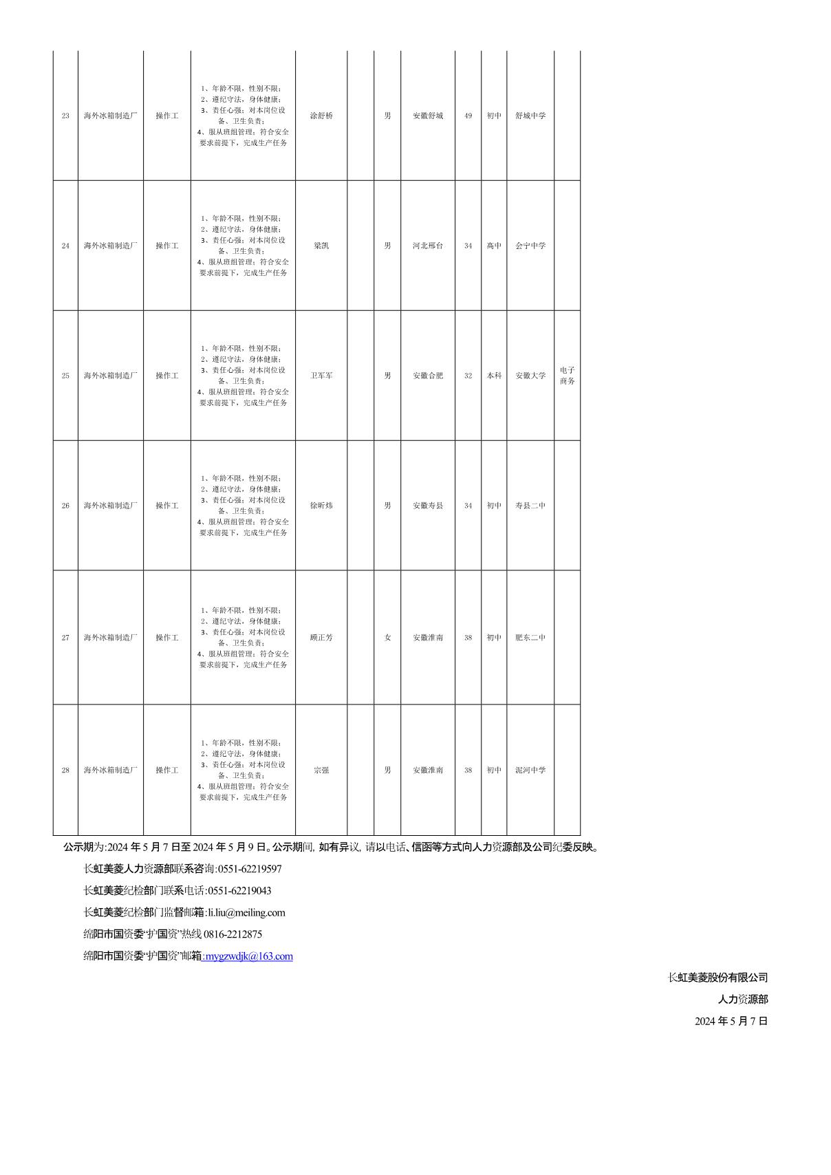 長虹美菱股份有限公司關(guān)于招聘設(shè)備電氣工程師等崗位擬錄用人員的公示