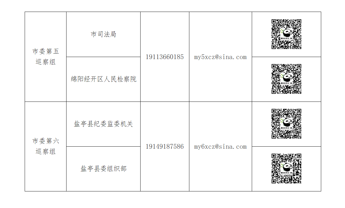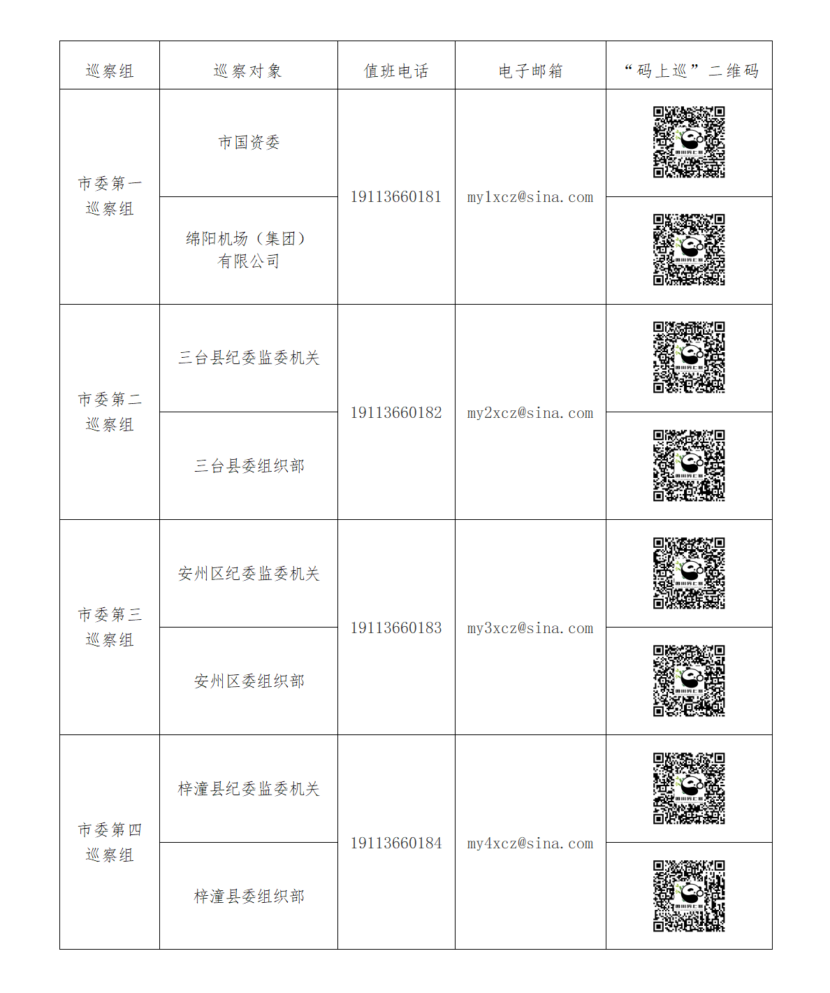 各市委巡察組設(shè)置值班電話(受理來電時間為工作日9:00-18:00)、電子郵箱、“四川碼上巡”二維碼,并設(shè)信訪接待點(受理群眾來訪時間為工作日9:00-12:00,14:00-18:00),信訪接待點地址分別為:綿陽市高新區(qū)火炬北路21號三匯金座A區(qū)一樓大廳、安州區(qū)花荄鎮(zhèn)銀河大道8號區(qū)政府大樓一樓2號門、三臺縣北壩鎮(zhèn)梓州干道95號、梓潼縣文昌鎮(zhèn)城北新區(qū)三號樓一樓、鹽亭縣鳳靈街道梓江路1號。巡察組主要受理反映被巡察黨組織領(lǐng)導(dǎo)班子及其成員和下一級黨組織領(lǐng)導(dǎo)班子主要負(fù)責(zé)人,以及重點崗位人員問題的來信、來電、來訪,重點是關(guān)于違反黨的政治紀(jì)律、組織紀(jì)律、廉潔紀(jì)律、群眾紀(jì)律、工作紀(jì)律、生活紀(jì)律等方面的舉報和反映。對其他不屬于巡察受理范圍的信訪問題,將按照分級負(fù)責(zé)、屬地管理原則,轉(zhuǎn)交有關(guān)單位認(rèn)真處理。