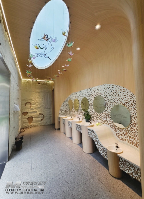 記者沿著綠蔭小道走進(jìn)這座被游客稱贊的旅游公廁。公廁外觀古色古香,內(nèi)部也是別有洞天,不僅處處裝修精致,墻上掛有景區(qū)精美風(fēng)景照和海綿生物礁圖案點(diǎn)綴更讓公廁充滿文化底蘊(yùn)。廁位干凈整潔,還配有母嬰室和“第三廁所”,可以兼顧不同人群的需求。
