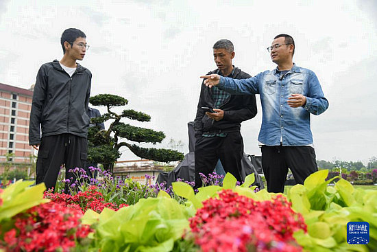 4月23日,在成都世園會溫江分會場,陳宏宇(右)和同事交流討論盆景擺放位置。