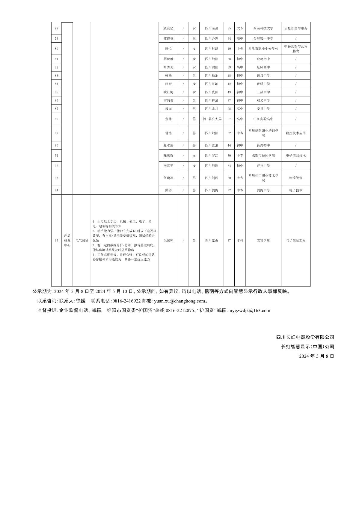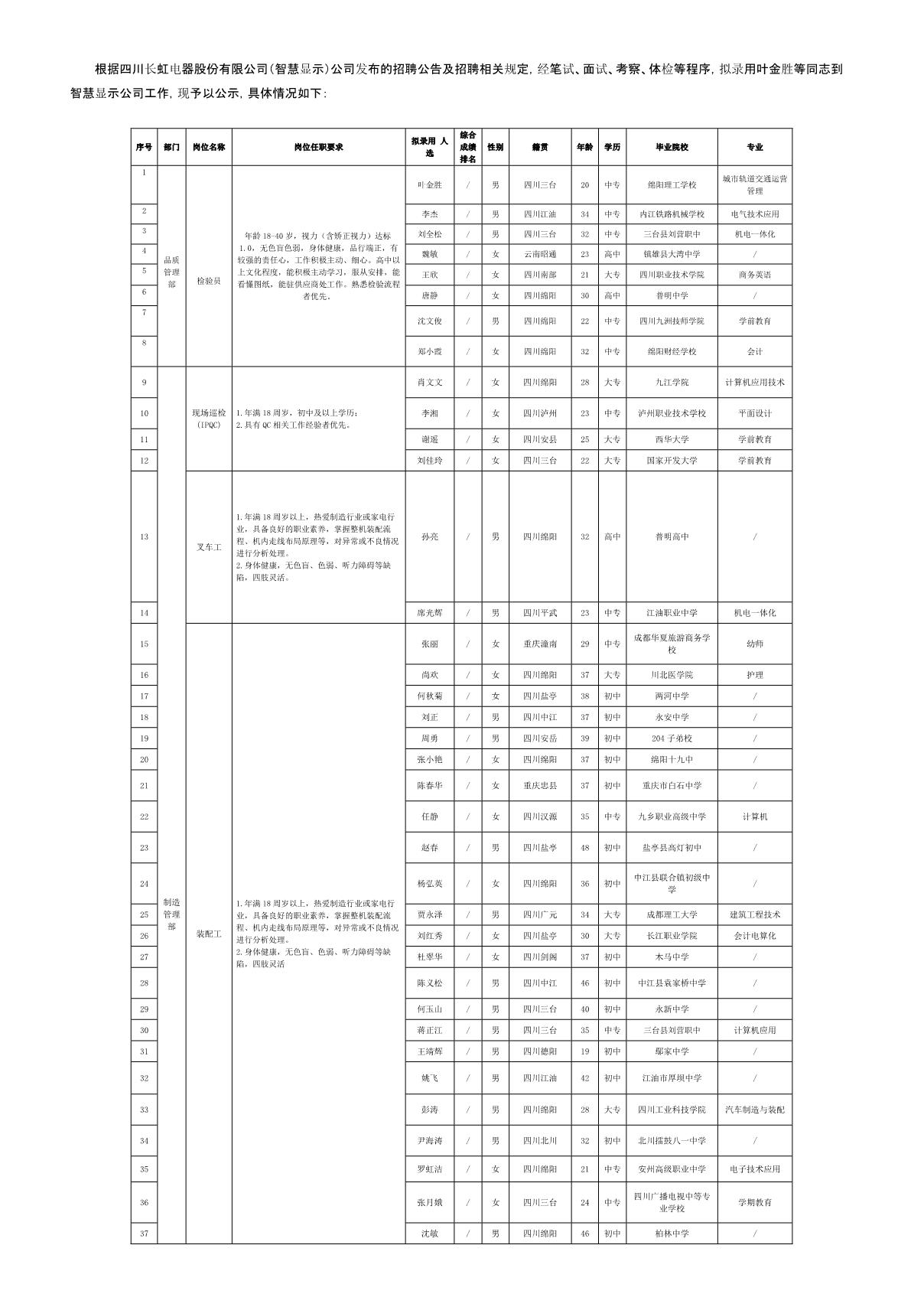 四川長(zhǎng)虹電器股份有限公司(智慧顯示)關(guān)于招聘檢驗(yàn)員等崗位擬錄用人員的公示
