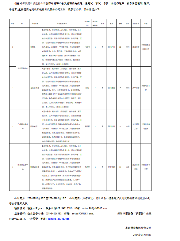 成都微精電機股份公司關(guān)于招聘采購員等崗位擬錄用人員的公示