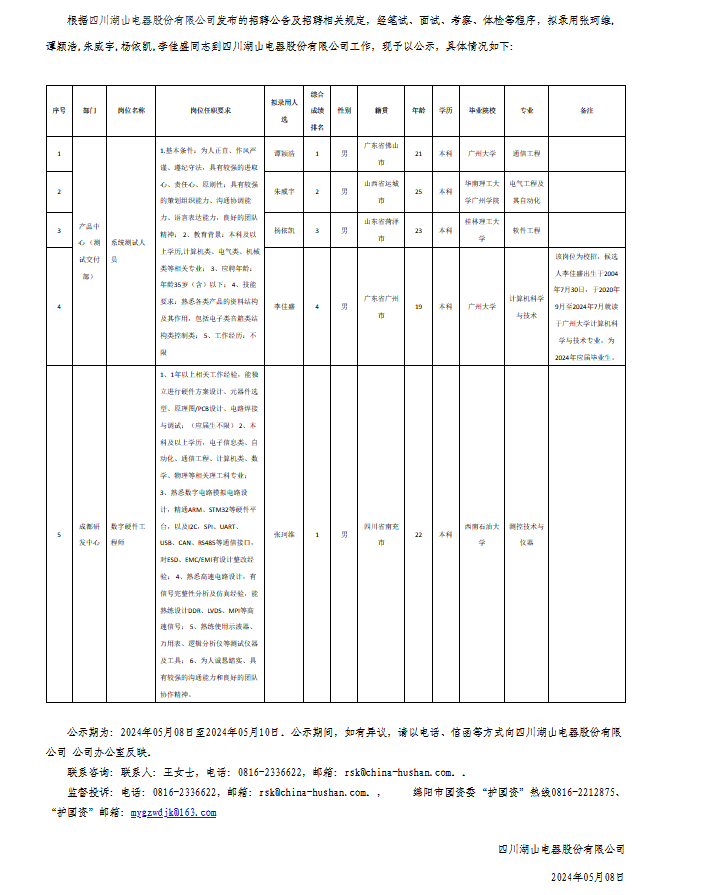 四川湖山電器股份有限公司關于招聘數字硬件工程師等崗位擬錄用人員的公示