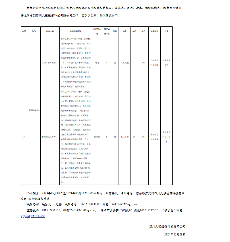 四川九強通信科技有限公司關(guān)于招聘射頻調(diào)試工程師等崗位擬錄用人員的公示