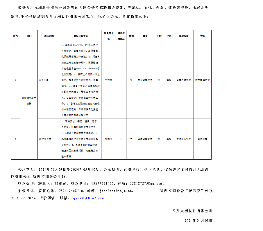 四川九洲軟件有限公司關于招聘軟件開發(fā)等崗位擬錄用人員的公示