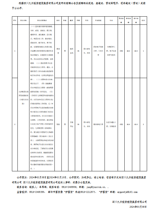 四川九洲投資控股集團有限公司關于招聘中層管理人員測試成績的公示