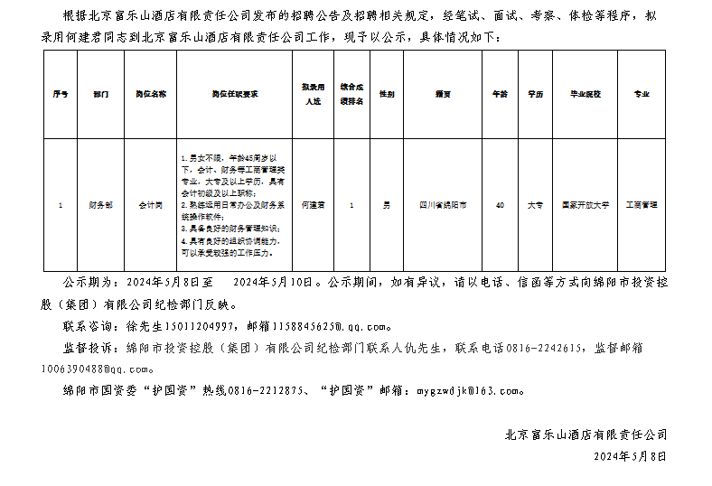北京富樂山酒店有限責(zé)任公司關(guān)于招聘財務(wù)會計崗位擬錄用人員的公示