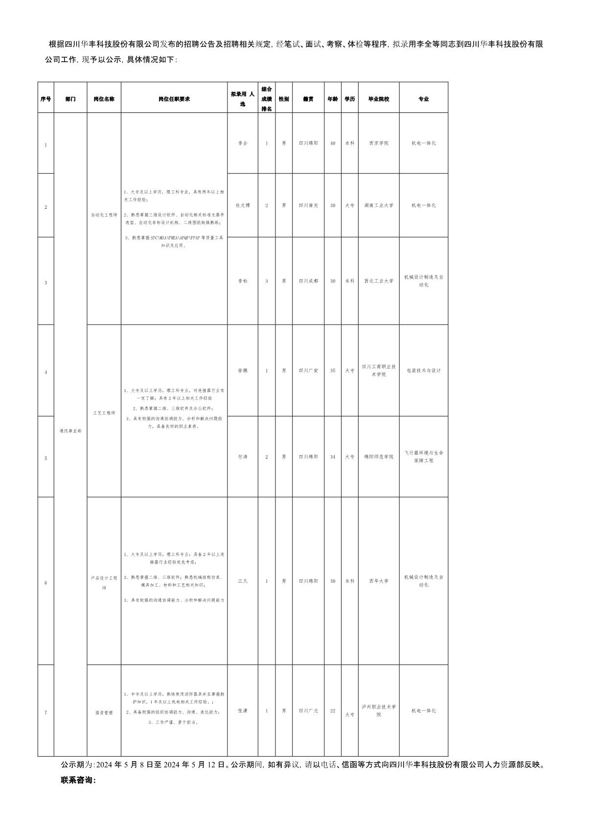 四川華豐科技股份有限公司關(guān)于招聘自動(dòng)化工程師等崗位擬錄用人員公示