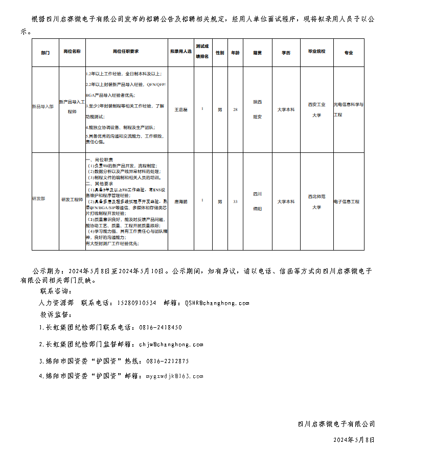 四川啟賽微電子有限公司關(guān)于招聘新產(chǎn)品導入工程師等崗位擬錄用人員的公示