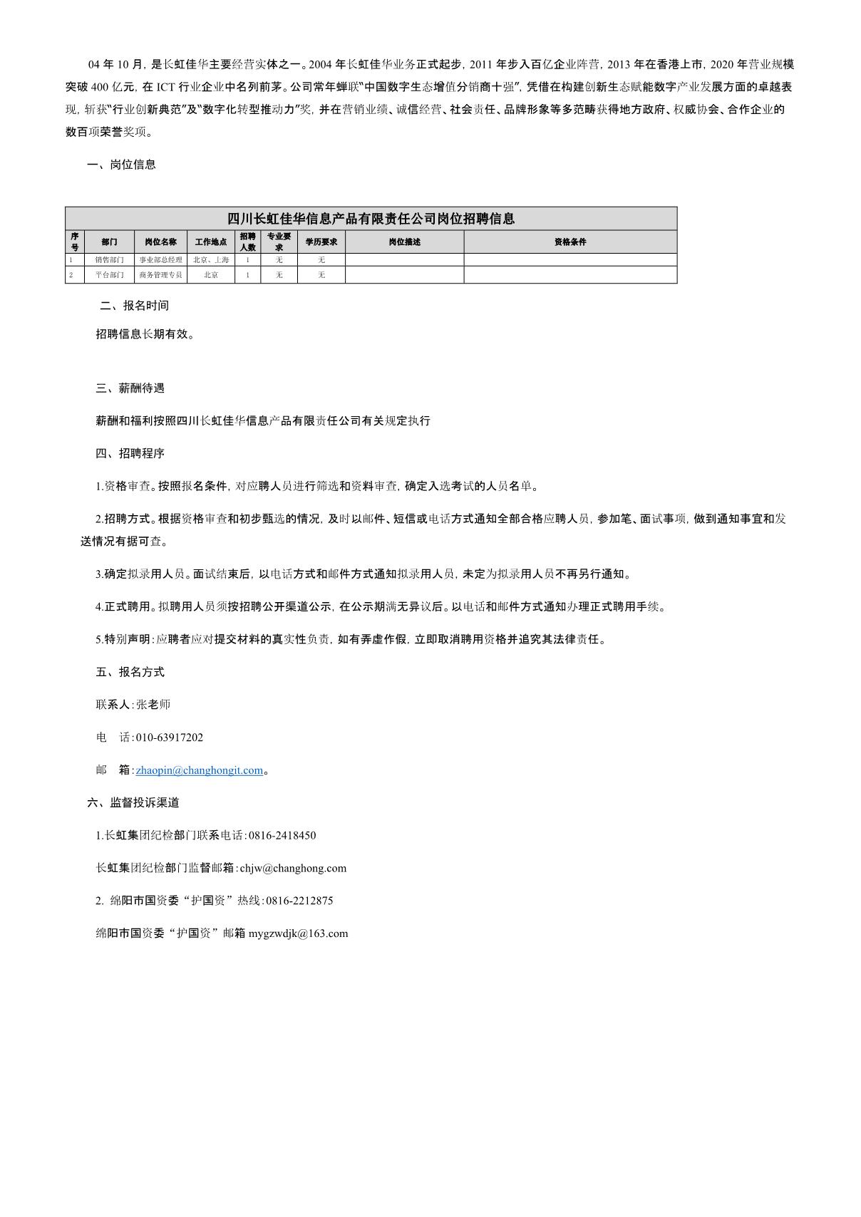 四川長虹佳華信息產(chǎn)品有限責(zé)任公司關(guān)于招聘商務(wù)管理專員等崗位的公告