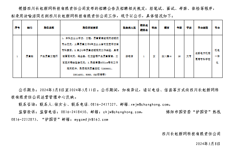四川長(zhǎng)虹新網(wǎng)科技有限責(zé)任公司關(guān)于招聘產(chǎn)品質(zhì)量崗位擬錄用人員的公示