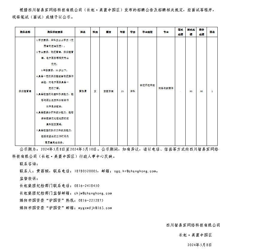 四川智易家網(wǎng)絡(luò)科技有限公司關(guān)于招聘供應(yīng)鏈管理崗位測(cè)試成績(jī)的公示