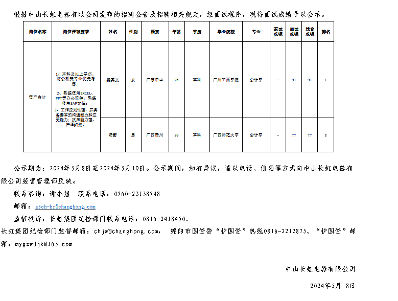 中山長(zhǎng)虹電器有限公司關(guān)于招聘資產(chǎn)會(huì)計(jì)崗位測(cè)試成績(jī)的公示