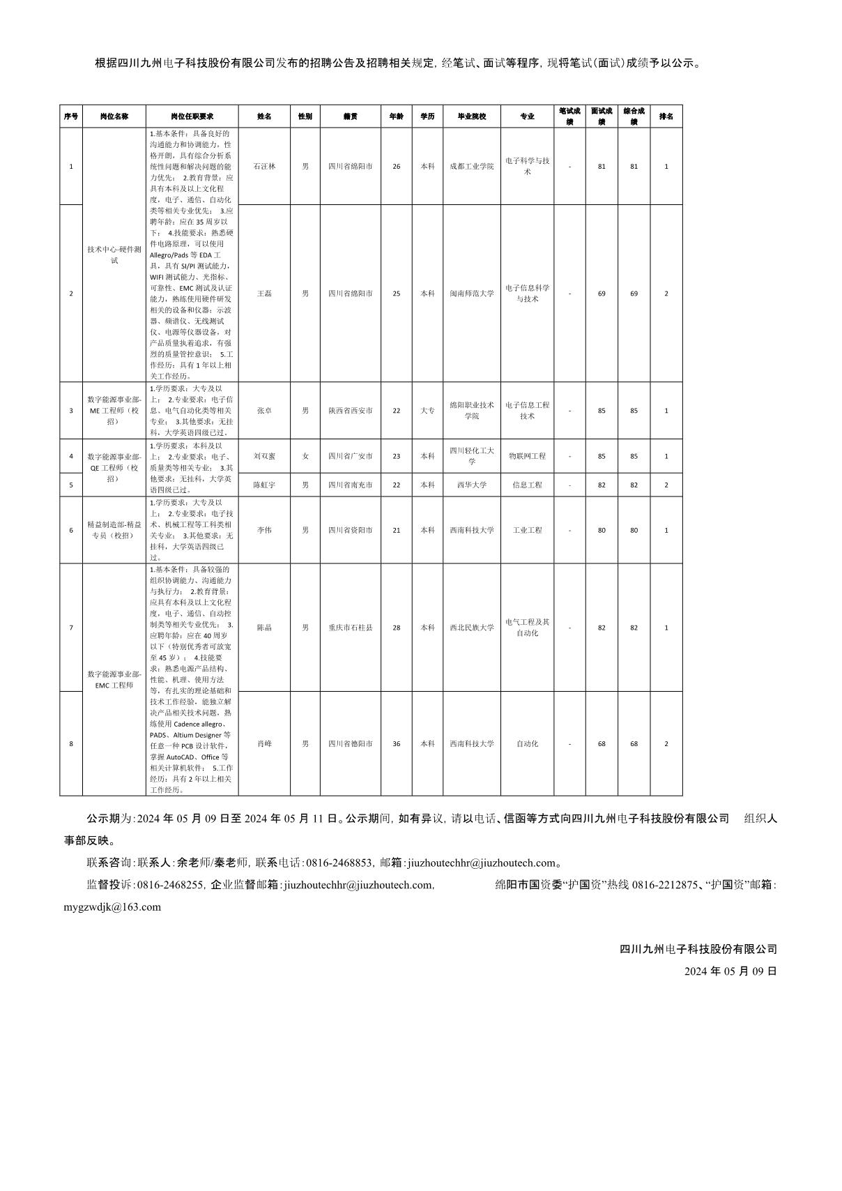 四川九州電子科技股份有限公司關(guān)于招聘精益專員(校招)等崗位測試成績的公示