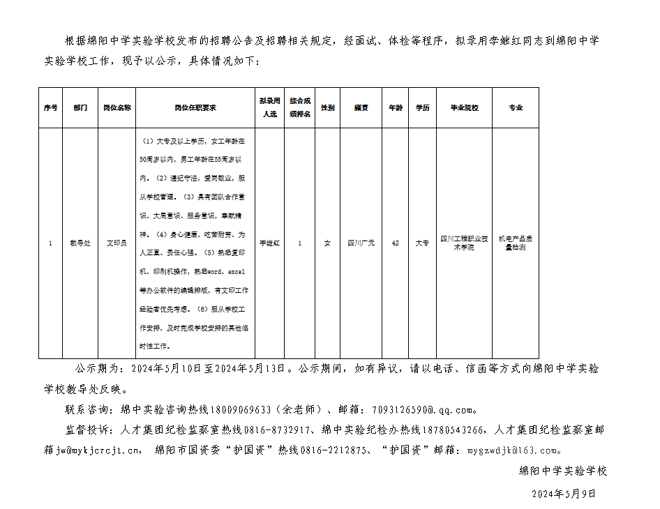 綿陽中學實驗學校關于招聘文印員崗位擬錄用人員的公示