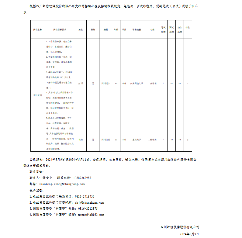四川虹信軟件股份有限公司關(guān)于招聘項(xiàng)目管理崗位測(cè)試成績(jī)的公示