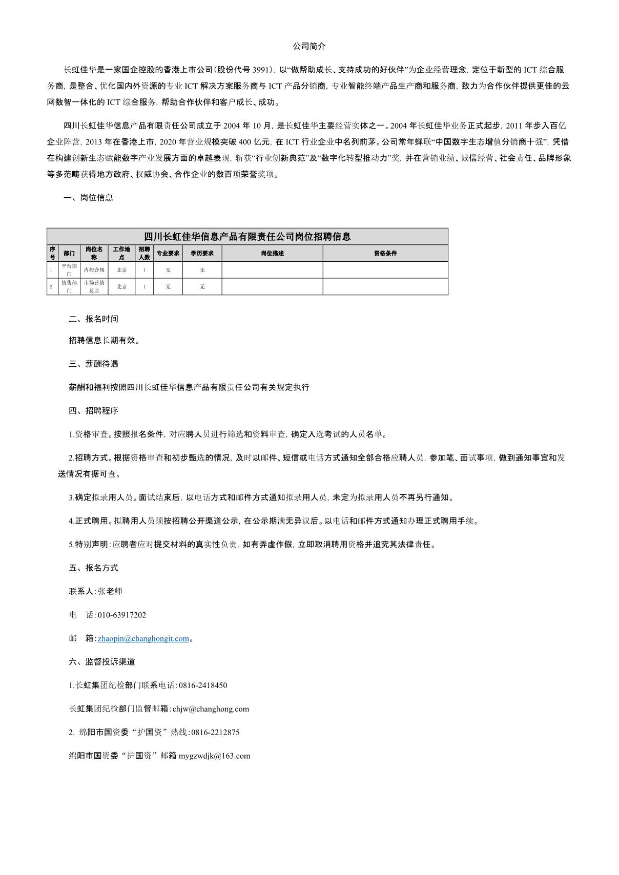 四川長虹佳華信息產(chǎn)品有限責(zé)任公司關(guān)于招聘內(nèi)控合規(guī)等崗位的公告