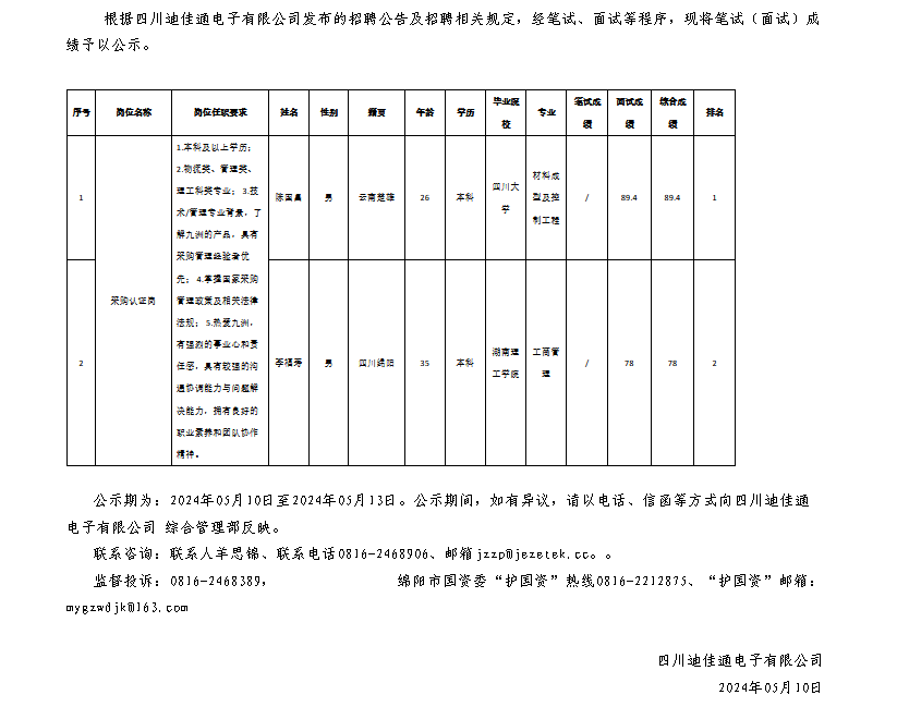 四川迪佳通電子有限公司關于招聘采購認證崗測試成績的公示