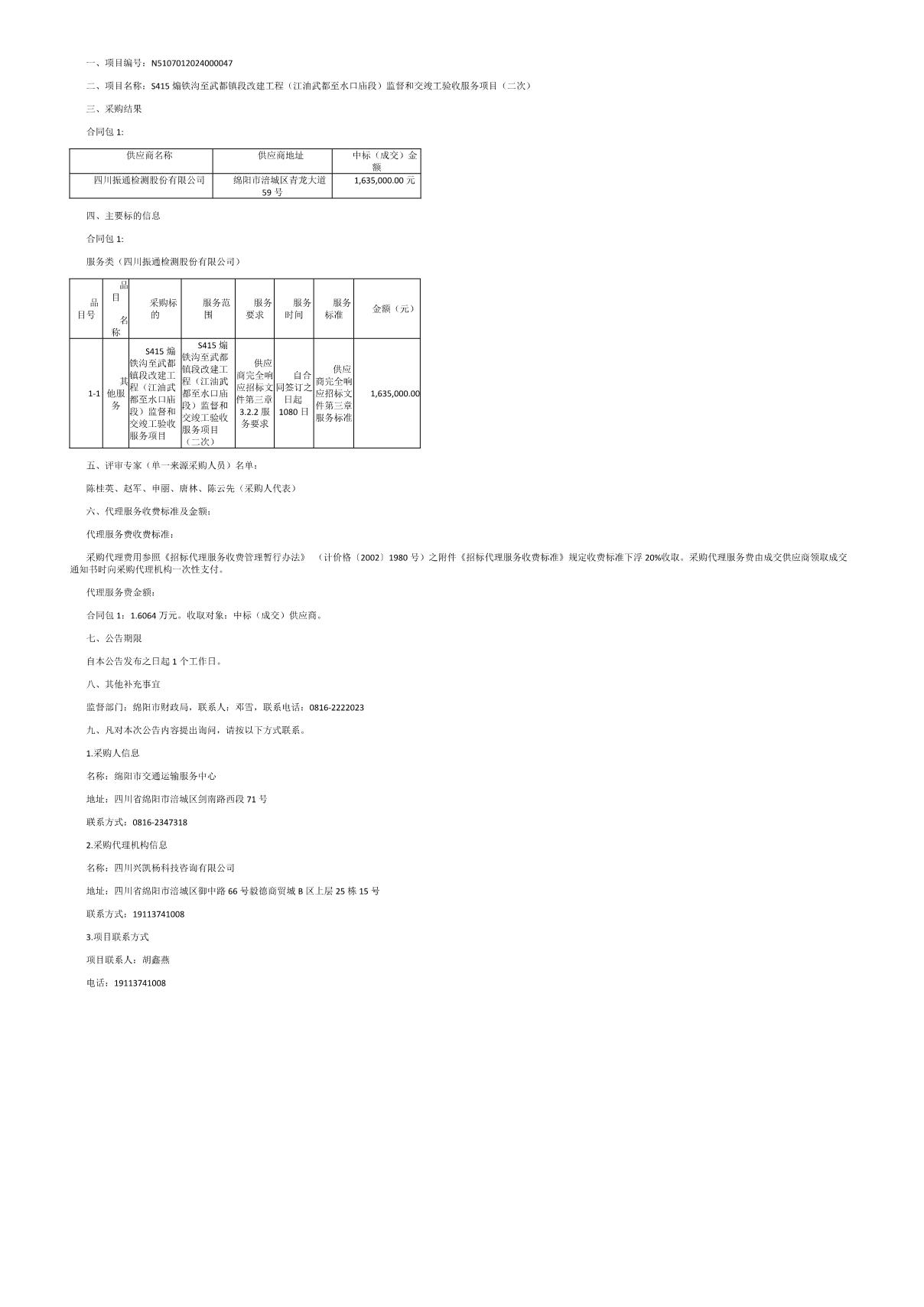 綿陽(yáng)市交通運(yùn)輸服務(wù)中心S415煽鐵溝至武都鎮(zhèn)段改建工程(江油武都至水口廟段)監(jiān)督和交竣工驗(yàn)收服務(wù)項(xiàng)目(二次)中標(biāo)(成交)結(jié)果公告