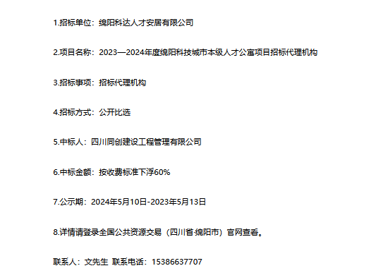 2023—2024年度綿陽科技城市本級(jí)人才公寓項(xiàng)目招標(biāo)代理機(jī)構(gòu)中標(biāo)(選)結(jié)果公示