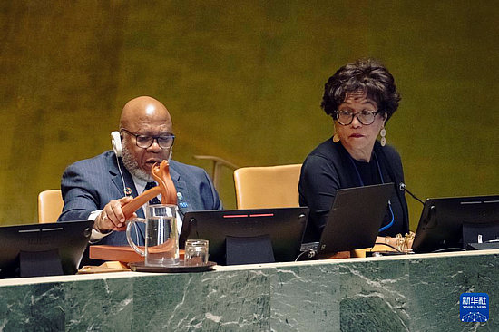 5月10日,在位于紐約的聯(lián)合國(guó)總部,聯(lián)大主席丹尼斯·弗朗西斯(左)落錘宣布決議通過(guò)。新華社發(fā)(聯(lián)合國(guó)供圖/曼努埃爾·伊萊亞斯攝)