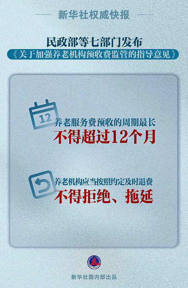 新華社北京5月10日電(記者高蕾)記者10日從民政部2024年第二季度例行新聞發(fā)布會(huì)上獲悉,民政部等七部門近日印發(fā)《關(guān)于加強(qiáng)養(yǎng)老機(jī)構(gòu)預(yù)收費(fèi)監(jiān)管的指導(dǎo)意見(jiàn)》,對(duì)預(yù)收費(fèi)用收取要求、使用用途等進(jìn)行規(guī)定。