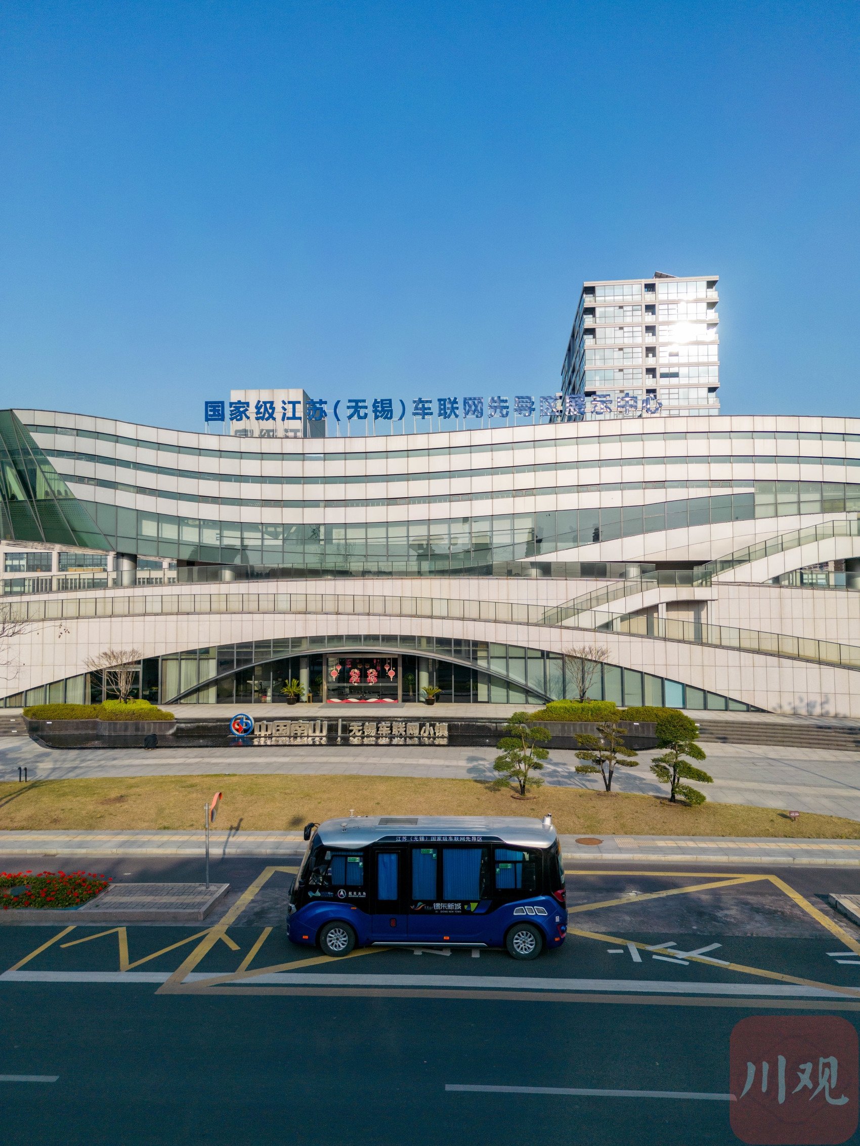 國(guó)家級(jí)江蘇(無(wú)錫)車聯(lián)網(wǎng)先導(dǎo)區(qū)展示中心樓前,??恐惠v無(wú)人小巴。