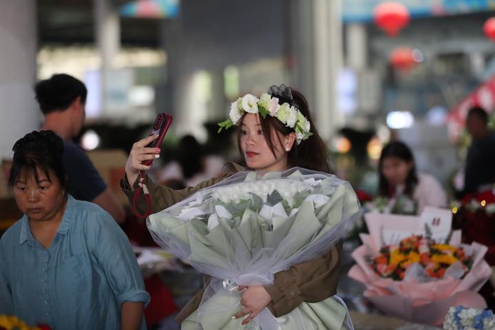 昆明斗南花卉交易市場(chǎng)內(nèi),游客正在抱著花束拍照打卡。(受訪者供圖)